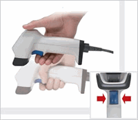 スキャナを置いた状態からさっと手に取れるデザインを採用しました。さらに、グリップ部分はやさしく手になじむふくらみ形状により長時間作業の負担を軽減。トリガは自然に手に掛かる作りでカチッとクリック感にもこだわりました。
